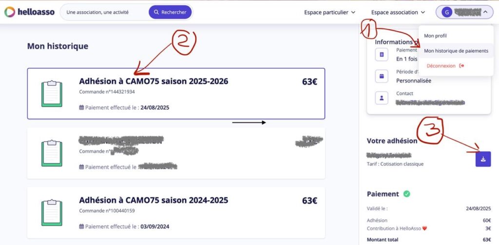 - Dans le volet de gauche, sélectionner « Adhésion à CAMO75 » pour la saison en cours